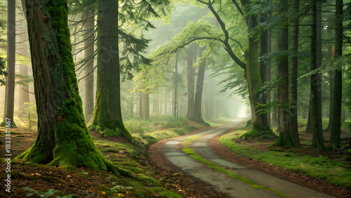 © AKTARUL, Fototapeta premium Misty forest path winding through tall green trees