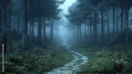 Fototapeta premium Misty Forest Path Winding Through Tall Pine Trees