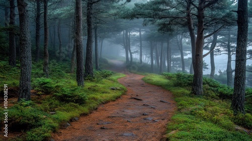 © Almahyra, Obraz premium Misty forest path winding through tall pines.