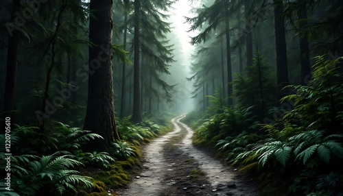 Fototapeta premium Misty Forest Path Winding Through Tall Trees Lush Greenery