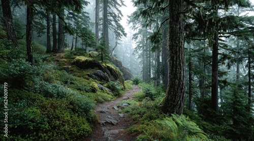 Obraz premium Misty forest path winds through lush greenery and tall trees