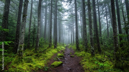 © isend, Obraz premium Misty forest path winds through tall evergreen trees.