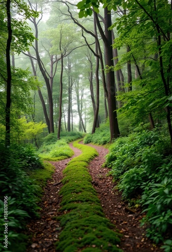 © Rainyphoto, Obraz premium Misty forest path winds uphill through lush, green foliage, fog, fairytale, ecology