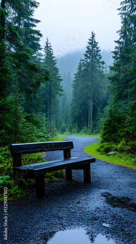 © CHURIN, Fototapeta premium Misty forest path with a bench