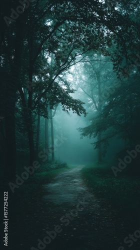 Obraz premium Misty forest path with deep blue fog and silhouetted trees creating a moody,...