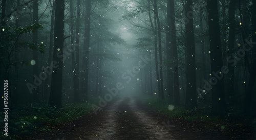 Fototapeta premium Misty forest path with glowing fireflies at twilight