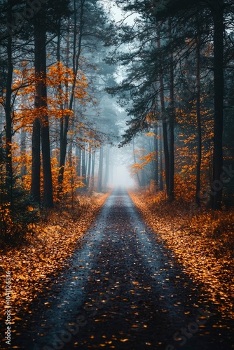 Naklejka premium Misty Forest Path with Golden Leaves in Autumn