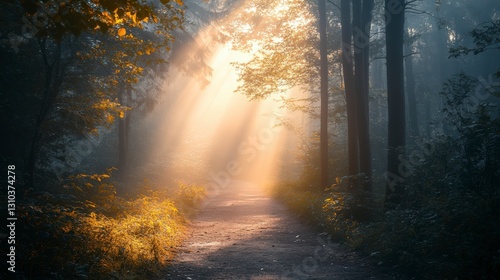 Obraz premium Misty Forest Path With Golden Sunbeams (Image) and Description for