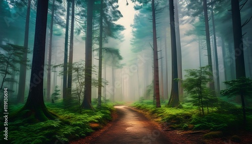© Raffaza, Fototapeta premium Misty forest path with lush greenery.