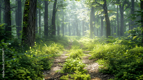 Obraz premium Misty forest path with lush vegetation and sunlight filtering through the...