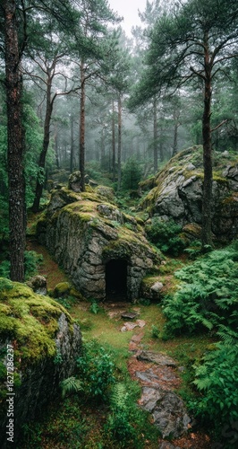 Obraz premium Misty forest path with mossy rocks and hidden entrance