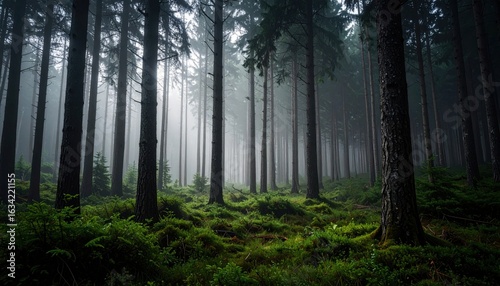 © Trukune, Naklejka premium Misty Forest Path With Pine Trees