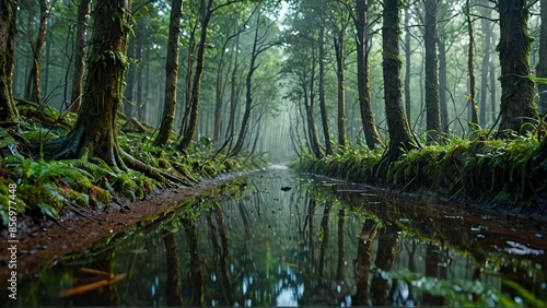 © BOJOShop, Fototapeta premium Misty Forest Path with Reflections.