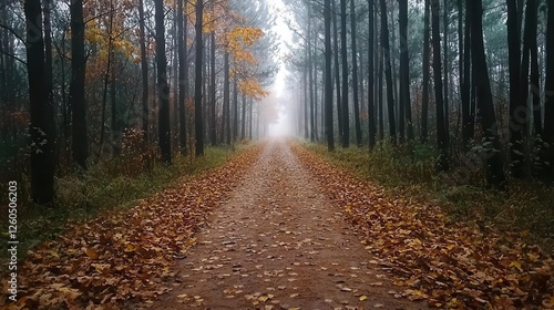 Obraz premium Misty forest path with scattered fallen leaves, creating a somber and quiet...