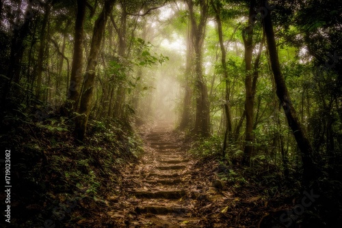 © Shindra, Obraz premium Misty forest path with stone steps (1)