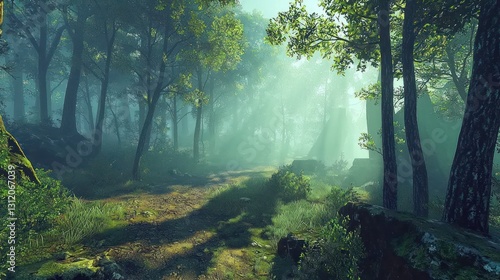 Obraz premium Misty forest path with sunlight.