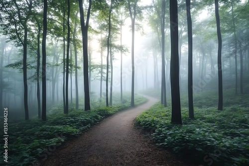© Adobe, Fototapeta premium Misty Forest Path with Sunlight.