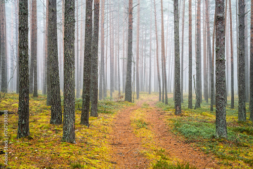 © alexugalek, Fototapeta premium Misty Forest Path with Tall Trees