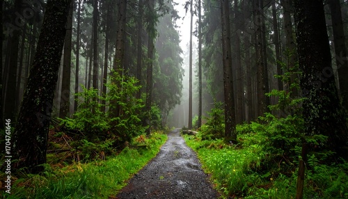 © athena, Obraz premium Misty Forest Path with Tall Trees and Lush Greenery.