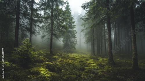 Obraz premium Misty forest path with tall trees and lush greenery. A mystical and serene...