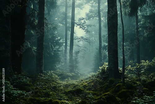 © Dimas, Obraz premium Misty Forest Path with Tall Trees and Lush Greenery in a Dreamy Landscape Ambiance