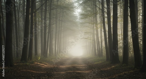 © Elja, Obraz premium Misty forest path with tall trees lining a trail leading to a bright light in the distance