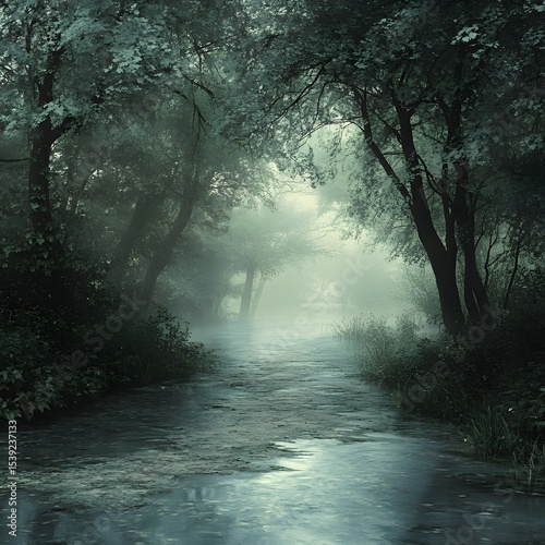 © Design Nest, Obraz premium Misty forest path with water flowing through the trees creating a serene and ethereal landscape view