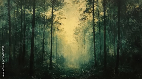 © GRACE, Naklejka premium Misty forest pathway in dense greenery with tall trees and soft light