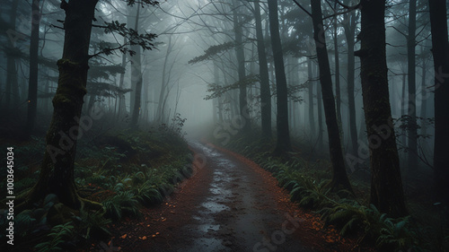 © Jessada, Fototapeta premium Misty Forest Pathway in Mysterious Foggy Landscape
