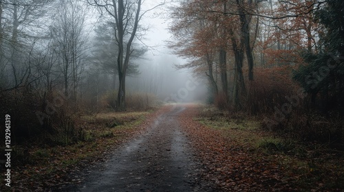 © nabila, Obraz premium Misty Forest Pathway Surrounded by Autumn Leaves and Fog