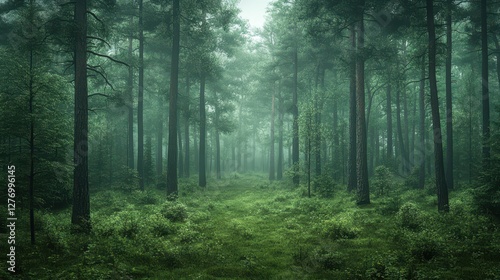 Obraz premium Misty forest pathway surrounded by tall evergreen trees in serene natural...