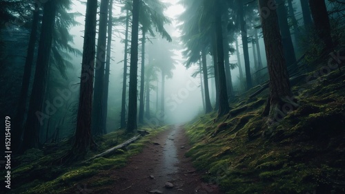 © Ekkarat_Studio, Obraz premium Misty Forest Pathway Surrounded by Tall Trees and Lush Greenery in Ethereal Light
