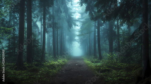 Obraz premium misty forest pathway tall trees
