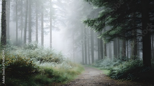 © Sam-th, Fototapeta premium Misty Forest Pathway Through Lush Trees and Wildflowers in Tranquil Woodland Setting