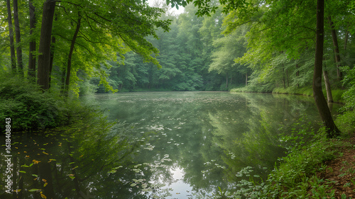 Obraz premium Misty Forest Pond Reflecting Trees and Leaves