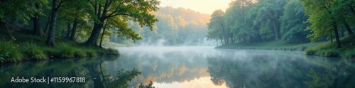 © chaikrit, Fototapeta premium Misty forest pond, still water reflects trees, still, reflective, forest