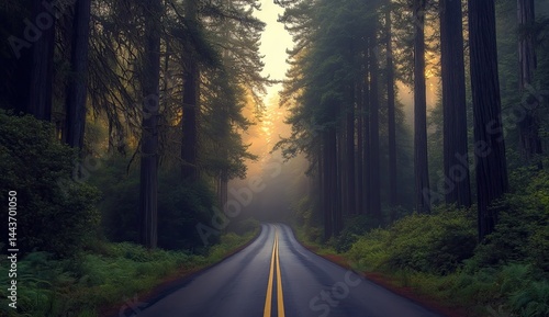 © Hajrah, Fototapeta premium Misty forest road at dawn. Sunlight peeks through tall trees