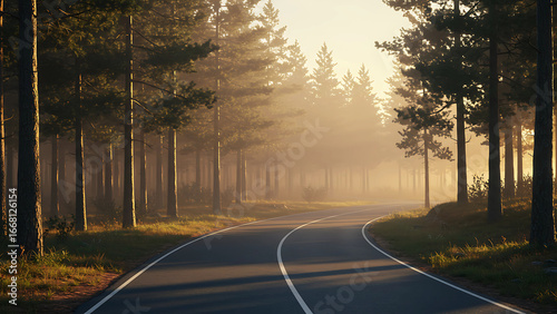 © Emperor, Fototapeta premium Misty Forest Road at Dawn with Golden Light – 4K Nature Background