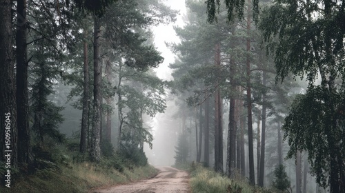 Obraz premium Misty Forest Road Serene Morning Fog in Pine Trees