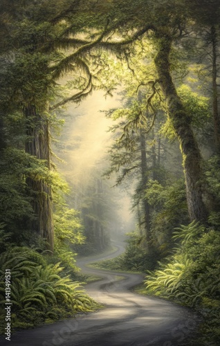 © Nurul, Fototapeta premium Misty forest road. Sunlight filters through trees