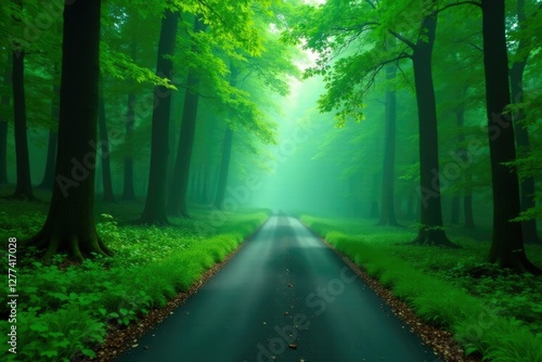 Naklejka premium Misty forest road winding through dense foliage, nature, trees, green