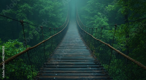 Obraz premium Misty forest rope bridge pathway, adventure