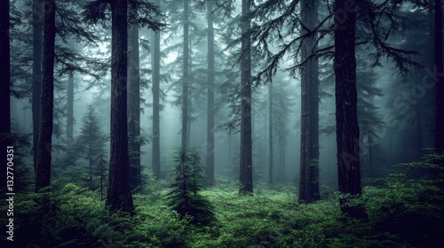 Fototapeta premium Misty forest scene, tall trees, tranquil