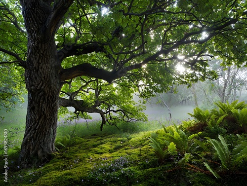 Fototapeta premium Misty forest scene with ancient moss covered tree and lush green ferns in soft sunlight