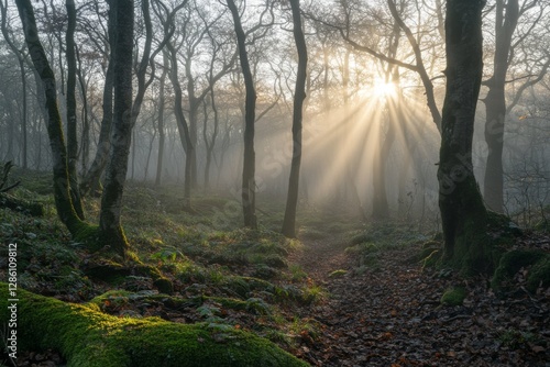 © Andrii Savchuk, Obraz premium Misty forest scene with dense trees and atmospheric lighting