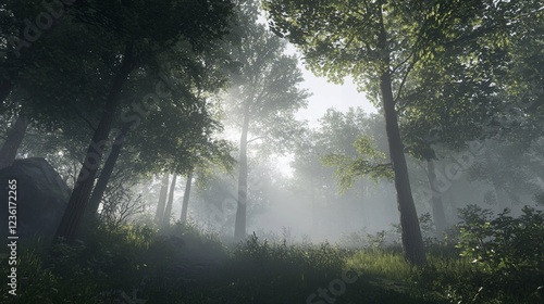 © adha, Obraz premium Misty Forest Scene with Sunlight Filtering Through the Canopy and Towering Trees