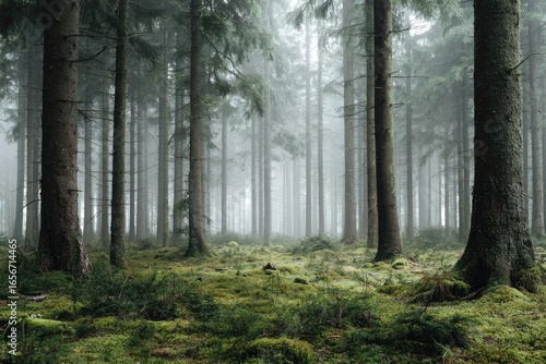 Obraz premium Misty forest scene with tall trees