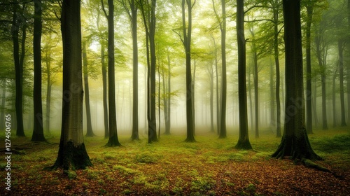 © Biancaart, Fototapeta premium Misty Forest Scene With Tall Trees And Green Undergrowth