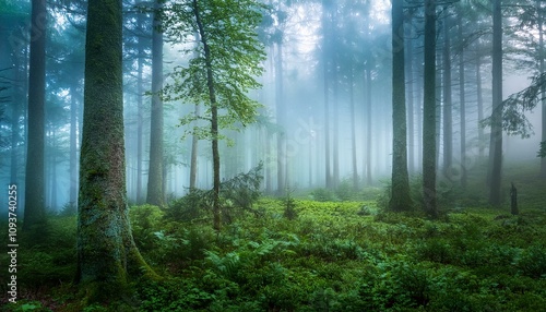 Fototapeta premium Misty forest scene with tall trees and lush green undergrowth.