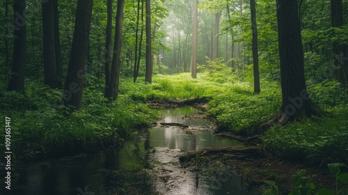 Fototapeta premium Misty Forest Stream: A Serene Woodland Escape